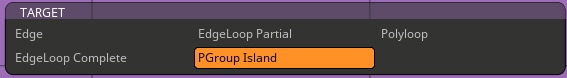 PolyGroup Island target(타깃)은 동일한 PolyGroup(폴리그룹)의 가장자리에 위치한 모든 polygon(폴리곤)들을 선택하고 다른 PolyGroup(폴리그룹)의 edge(에지)를 만날 때까지 계속 선택을 확장합니다.